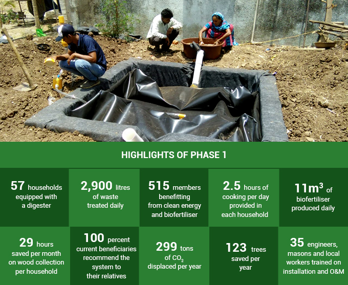 Based on the success of Phase I, the project was scaled up in 2018 to extend the impact of biodigesters to 45 more families. The second phase was aimed at encouraging more financial ownership and commitment by the beneficiaries. The local community in Dahod district was made aware of the initiative by conducting on-field demonstrations at sites where these systems were installed earlier. Facilitating a conversation between old beneficiaries and new potential beneficiaries led to signups for Phase II. For every unit installed, the beneficiaries were required to contribute Rs 8,000 to receive the digester systems, while CInI and SELCO Foundation contributed an amount of Rs 39,250. Subsequently, the project team ensured adoption of the systems by conducting extensive monitoring visits to address usage and operational barriers like improper water mixing, less dung feeding, etc.