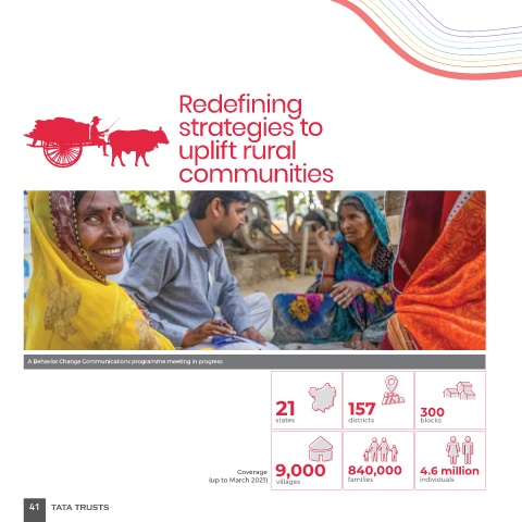 Redefining strategies to uplift rural communities A Behavior Change Communications programme meeting in progress 21 157 300 states districts blocks 9,000 840,000 4.6 million Coverage (up to March 2021) villages families individuals 41