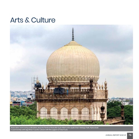 Arts & Culture Restoration work being undertaken atop the Tomb of Abdullah Qutb Shah at the Qutb Shah Heritage Park, Hyderabad, in partnership with Aga Khan Trust for Culture with the support of Tata Trusts ANNUAL REPORT 2020-21 76