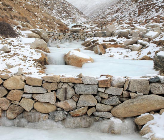 A series of stone bunds were built in each village, particularly in the shady parts of streams. The bunds impeded the flow of water, making shallow pools that freeze in winters. The process of ice formation continues during winter months and a huge reserve of ice accumulates on the mountain slope, aptly termed as an ‘artificial glacier’. The artificial glaciers are located at lower altitudes as compared to natural ones so that they start to melt much earlier as compared to a natural glacier, ie, in the month of April, and supplements meltwater. Artificial glaciers have proved to be a simple, cost-effective and unique technique for harnessing and conserving water in high-altitude་ regions.