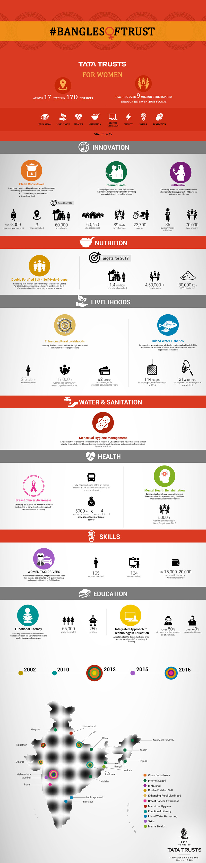 What furthers a nation is the education & empowerment of its women who constitute an integral part of our country’s progress. Like a set of bangles that are integral to a woman’s identity, fundamentals, such as health, nutrition, sanitation, livelihoods, rights-based advocacy and digital literacy, are critical to her development. These initiatives not only seek to elevate women’s position in the society but also help them earn their livelihoods. This focus is also of national priority as is evident in the Central Government’s ‘Beti Bachao, Beti Padhao” yojana. Tata Trusts have always valued the catalytic effect that enabling women has in transforming communities and recognises the need for their empowerment. Read more